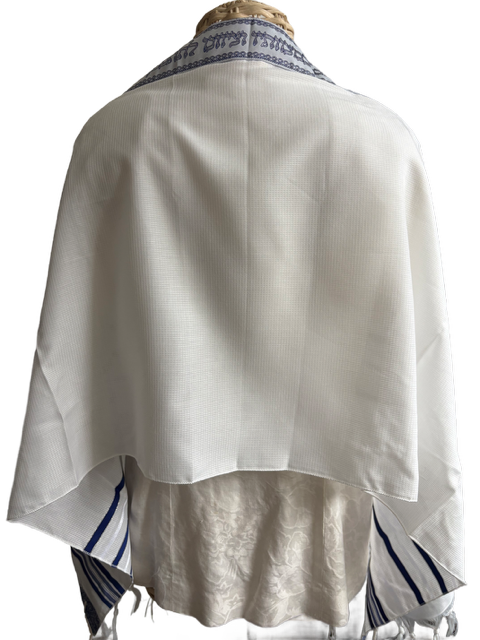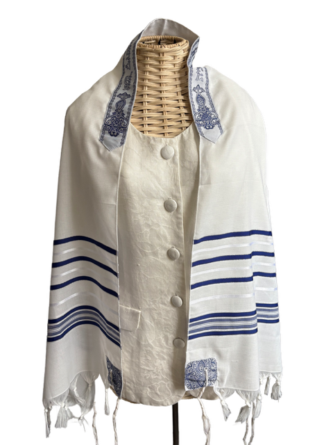 This conservative tallit blue and silver is perfect as a quality prayershawl at an affordable price. The Ephriam tallit will match everything – and the colors of blue and silver are very rich. Matching tallit bag included. Sometimes the bag will have a print of coordinating embroidery, although the one shown is plain blue velvet. Made in Israel.